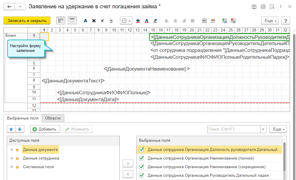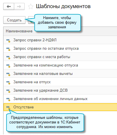 Добавлена возможность использовать свои формы заявлений, которые сотрудники направляют через сервис 1С:Кабинет сотрудника. Для этого достаточно настроить их шаблоны в справочнике "Шаблоны документов".