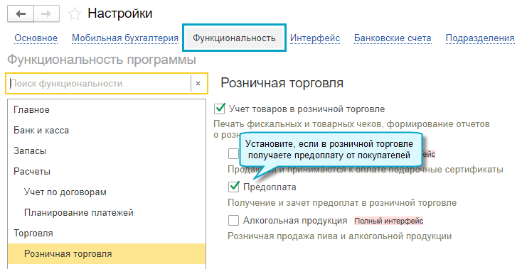 Полный интерфейс: меню "Главное - Настройки - Функциональность - Розничная торговля".