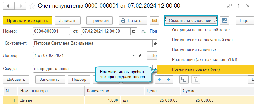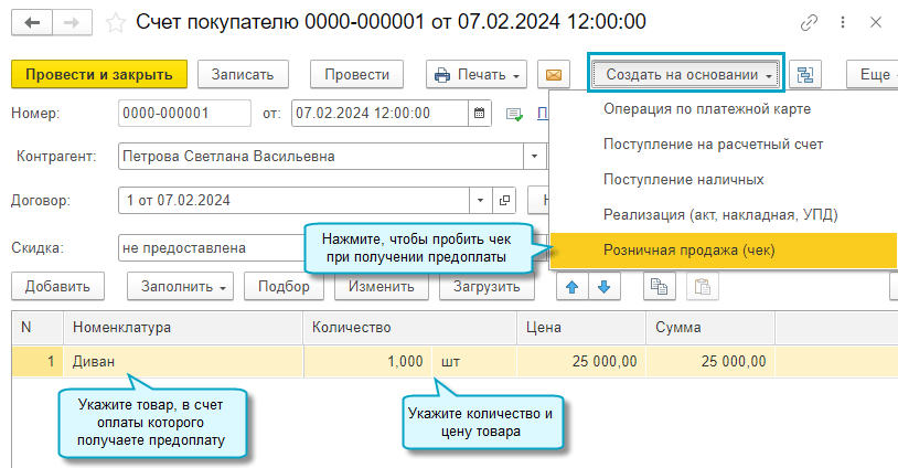 После закрытия кассовой смены полученная предоплата отражается в отчете о розничных продажах по контрагенту, указанному в счете покупателю. Также изменяется статус счета покупателя по его оплате.