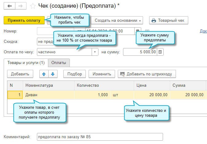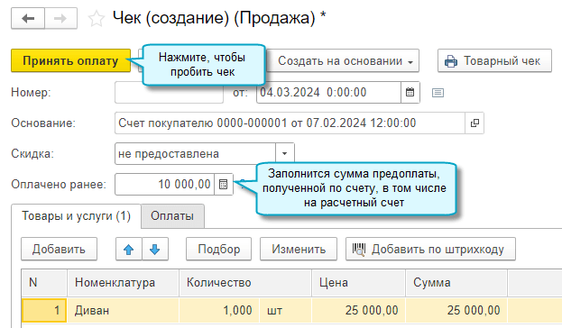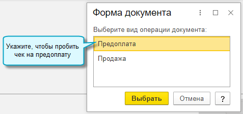 Оформляйте чек на продажу на основании чека на предоплату, если можете его найти в общем списке, например, по комментарию. Тогда чек на продажу автоматически заполнится по его данным.