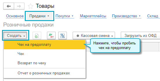 Простой интерфейс: меню "Товары - Продажи - Розничные продажи".