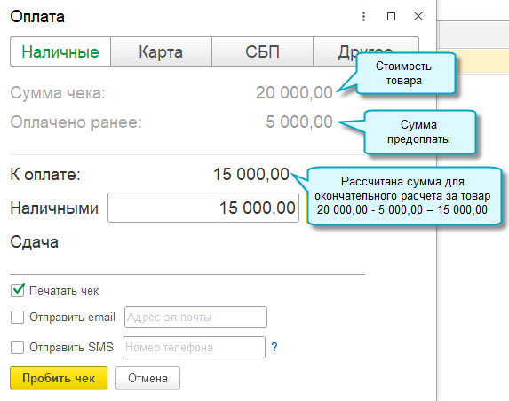 Добавлена возможность отражать розничные продажи в случаях, когда покупатели вносят предоплату за товар. Кассовые чеки пробиваются на предоплату и на отгрузку с зачетом предоплаты.