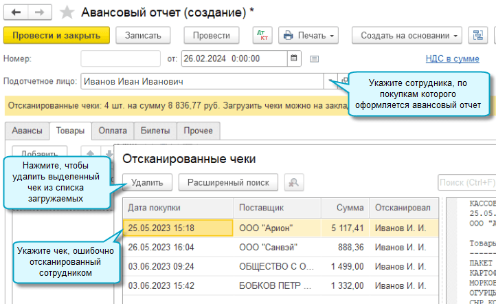 Добавлена возможность перед загрузкой в авансовый отчет удалять чеки, ошибочно отсканированные подотчетными лицами, например, по их личным покупкам.