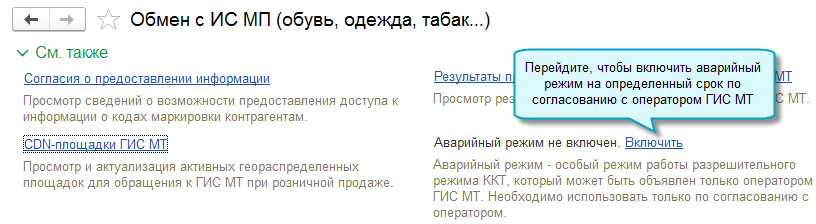 Поддержана возможность установления аварийного режима, в случае его объявления оператором ГИС МТ. Во время его действия не выполняются запросы в ГИС МТ. Аварийный режим устанавливается на определенное время, по истечении которого автоматически отключается.