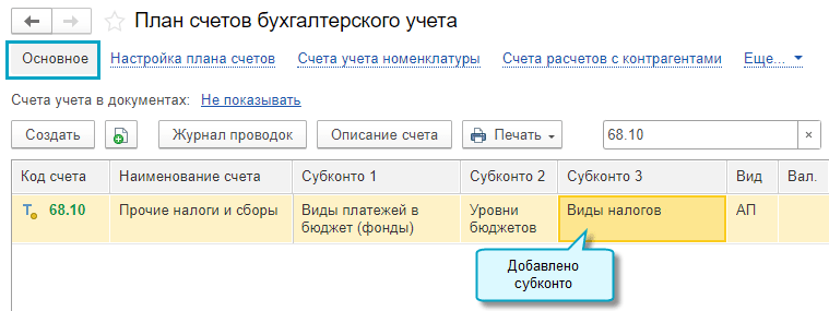 Добавлена возможность учитывать расчеты по прочим налогам и сборам в разрезе налогов. Для этого к счету 68.10 "Прочие налоги и сборы" добавлено субконто "Виды налогов".
