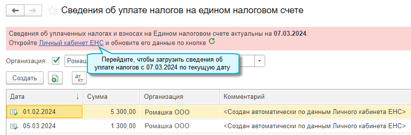 Сведения об уплате налогов загружаются автоматически из Личного кабинета, если используется сервис 1С-Отчетность. Если вы ещё не пользуетесь 1С-Отчетностью, то воспользоваться этим функционалом вы сможете, если подключитесь по специальному тарифу "Промо ЕНС" на 6 месяцев.
