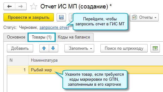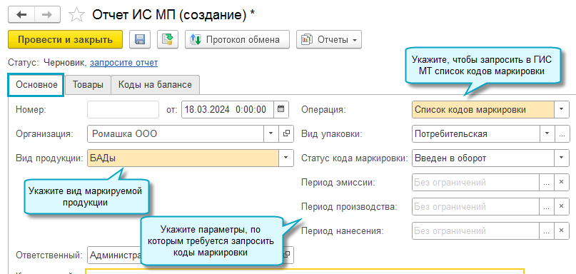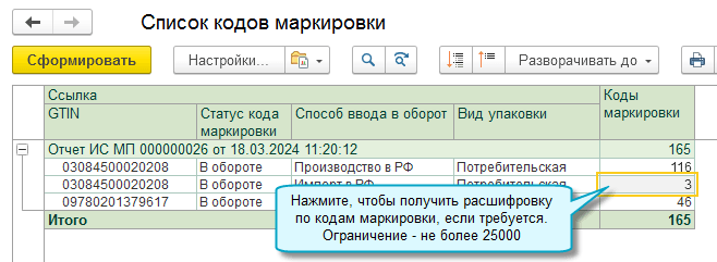 Добавлена возможность получить из ГИС МТ список кодов маркировки на балансе организации или сведения об отклонениях. Для этого потребуется запросить отчет.