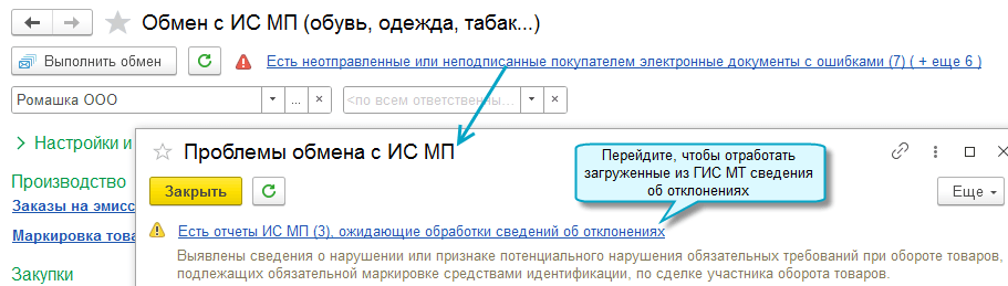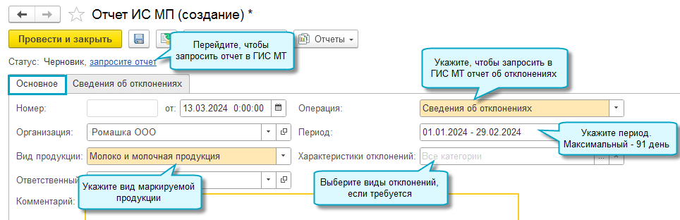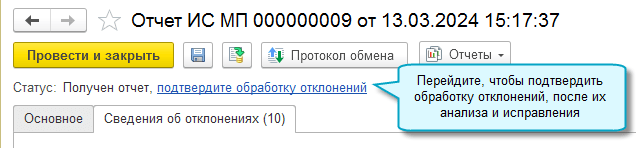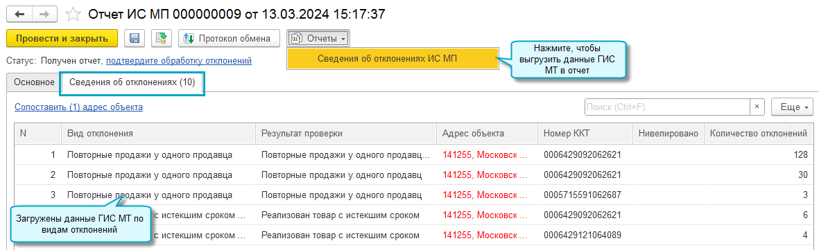 Чтобы получить из ГИС МТ сведения о выявленных или потенциальных нарушениях при обороте товаров, запросите отчет ИС МП с операцией "Сведения об отклонениях". Используйте полученные данные для их устранения.