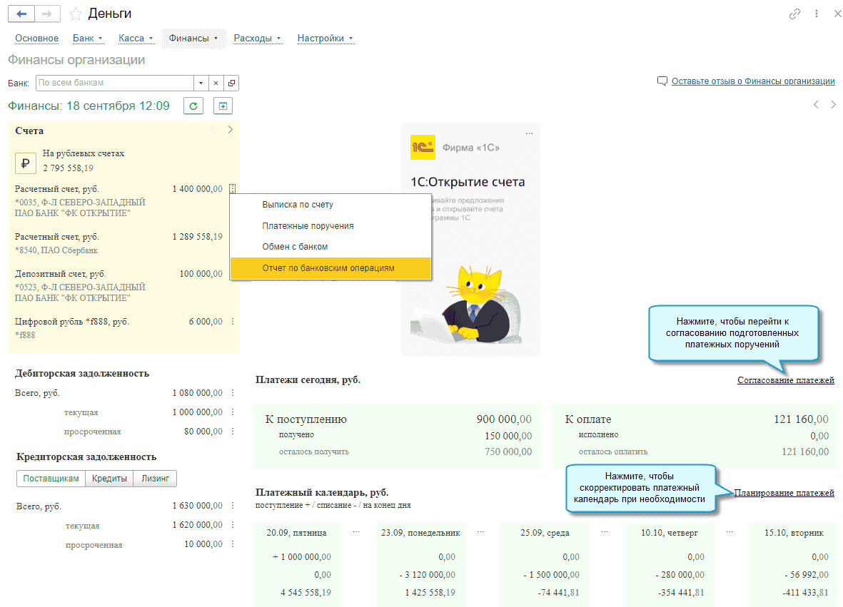 Данные об остатках на счетах и привычные отчеты руководителя о расчетах с покупателями и поставщиками помогут оценить текущее финансовое состояние. Потом можно сразу перейти к согласованию подготовленных платежных поручений.