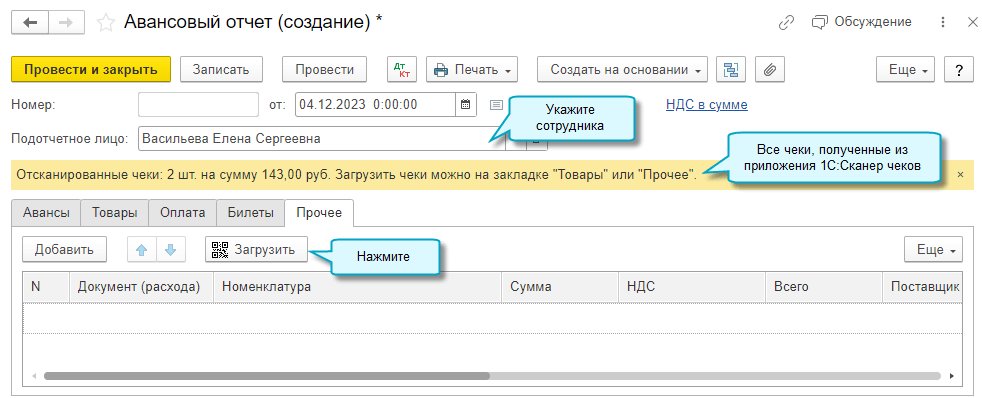Выполните следующие шаги, чтобы заполнить Авансовые отчеты и Путевые листы данными кассовых чеков: