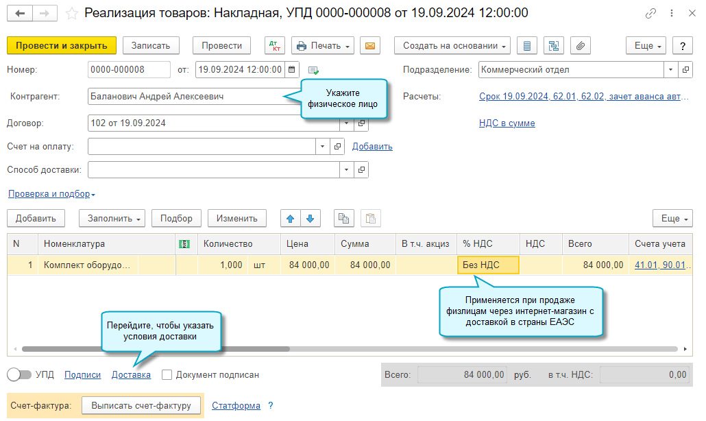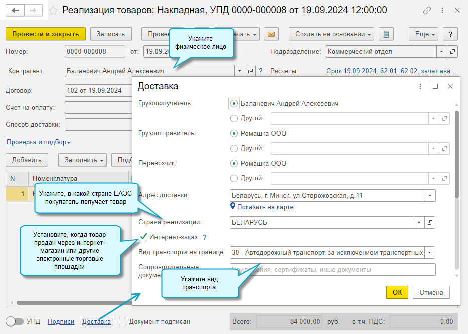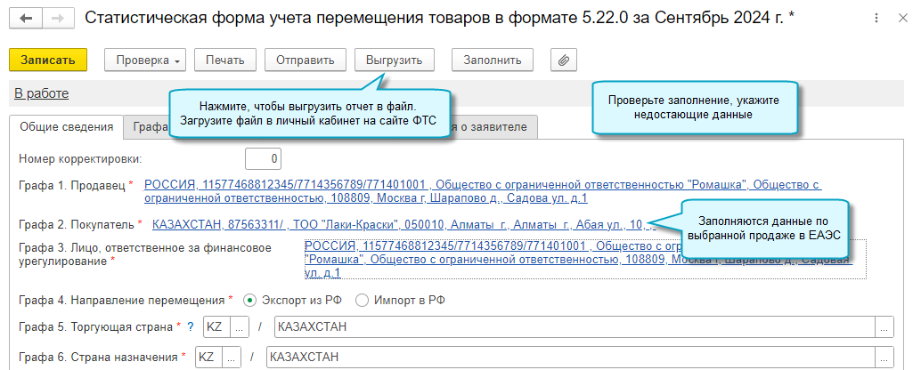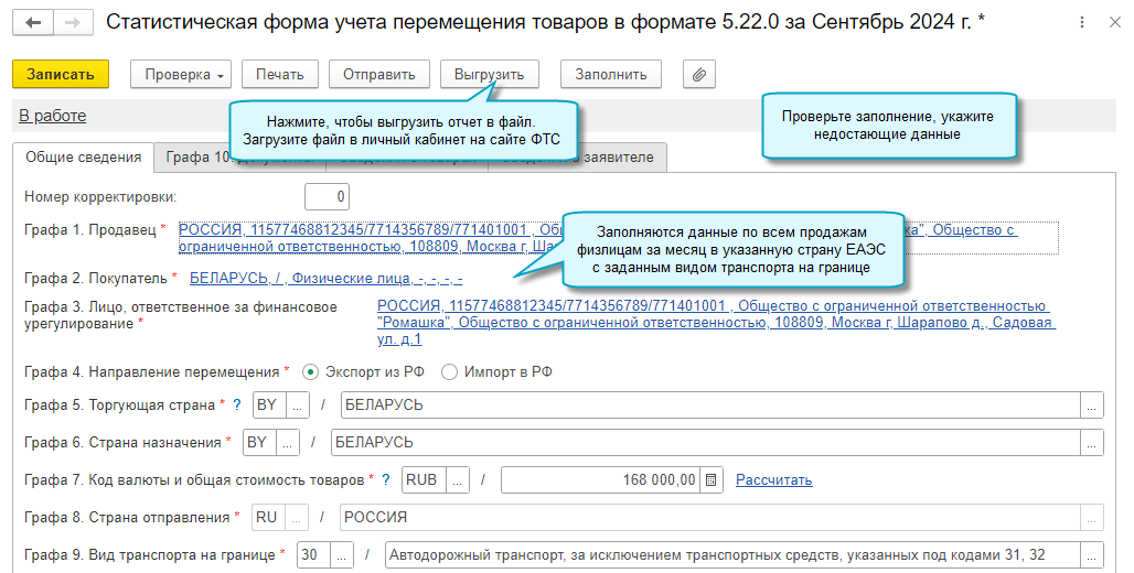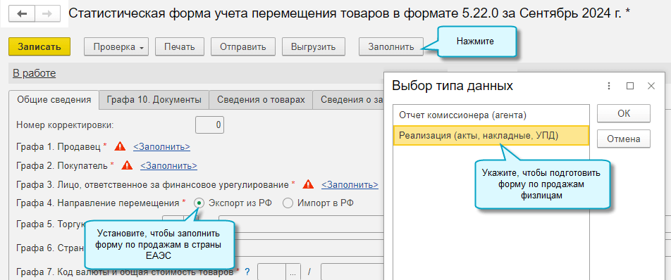 Добавлена возможность заполнить статистическую форму учета перемещения товаров, когда товары реализуются физическим лицам в ЕАЭС через свои электронные торговые площадки (не через маркетплейсы). Физические лица получают товар за пределами РФ на территории другого государства-члена ЕАЭС.