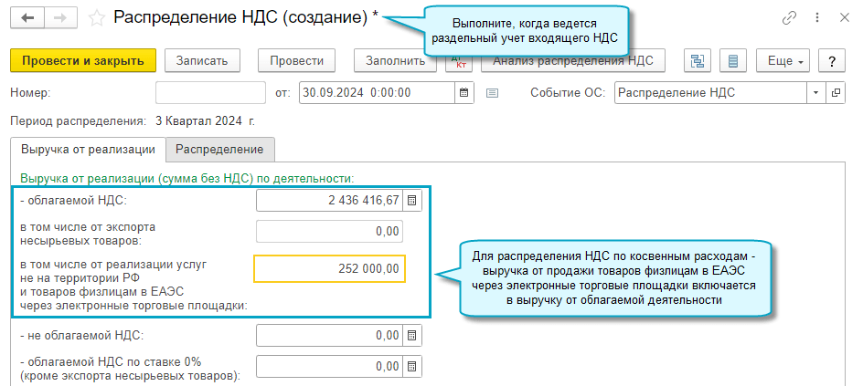 Полный интерфейс: меню "Операции - Закрытие месяца - Регламентные операции НДС - Распределение НДС".