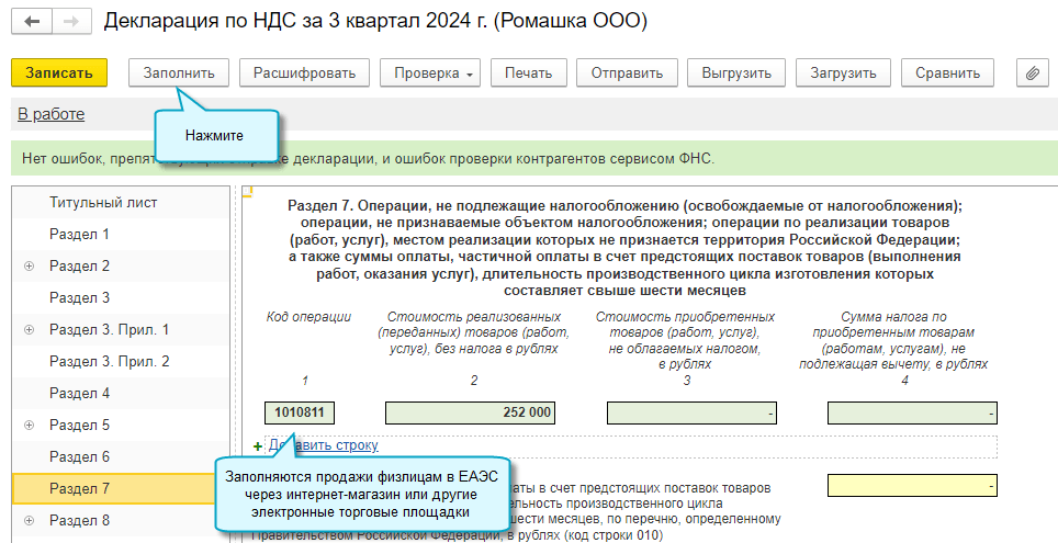 Добавлена возможность заполнить налоговую декларацию по НДС, когда товары реализуются физическим лицам в ЕАЭС через свои электронные торговые площадки (не через маркетплейсы). Физические лица получают товар за пределами РФ на территории другого государства-члена ЕАЭС.