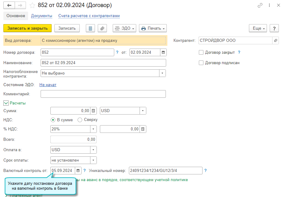 Добавлена возможность указать дату постановки на учет в банке договора, подлежащего валютному контролю. Она используется при заполнении статистической формы учета перемещения товаров.