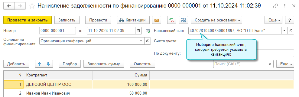 Добавлена возможность в Начислении задолженности по финансированию указать банковский счет, который будет выводиться при печати квитанций.