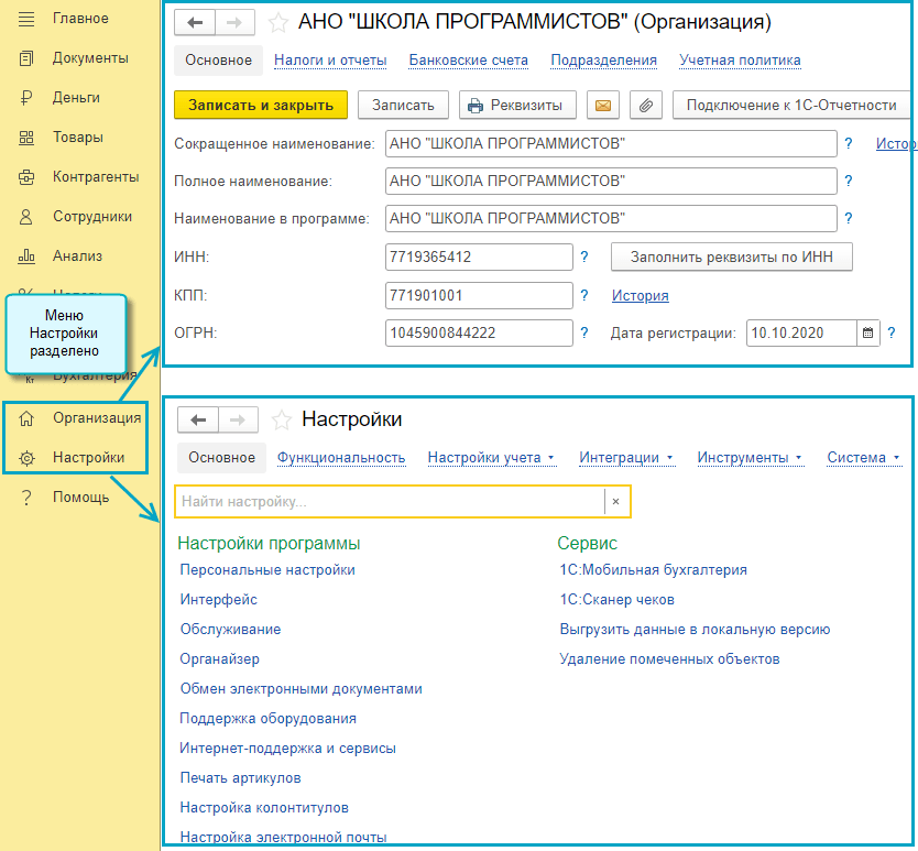 Раздел Настройки в простом интерфейсе разделен на два раздела: