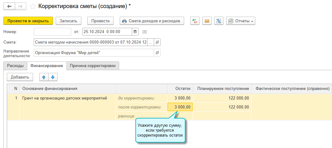 Добавлена возможность изменять остаток финансирования при корректировке сметы.