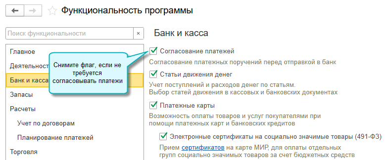 "Согласование платежей" включается автоматически при переходе на использование полной функциональности. Если не требуется согласовывать платежи перед их отправкой в банк, выключите эту функциональность.