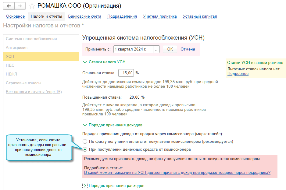 Добавлена возможность выбрать порядок признания дохода от продаж через комиссионера при УСН.