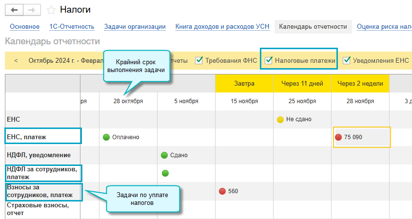 В календаре отчетности теперь отражаются налоговые платежи.