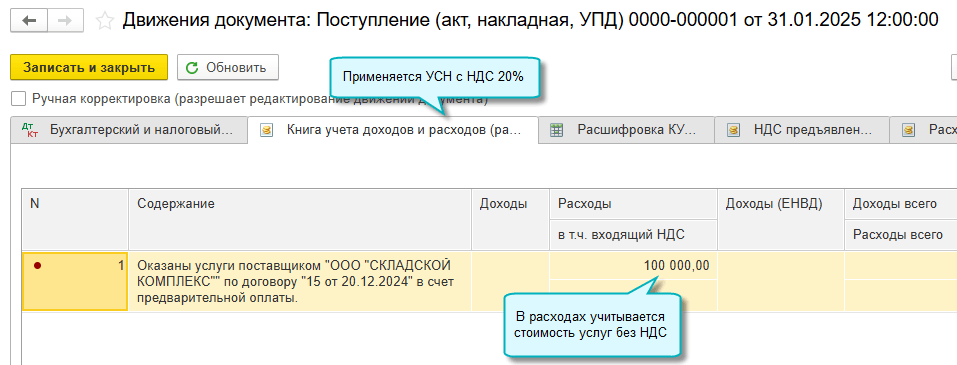 Чтобы НДС поставщиков не включался в расходы, плательщикам УСН со ставкой НДС 20% требуется выделять его в документах поступления, указывать в поступлении реквизиты полученного счета-фактуры или УПД.
