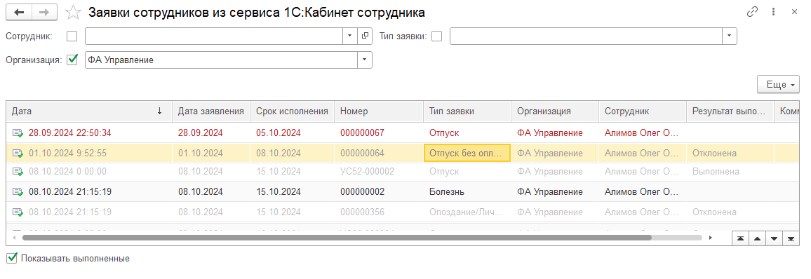 Простой интерфейс: меню "Сотрудники - Интеграция - Сервис 1С:Кабинет сотрудника - Заявки 1С:Кабинет сотрудника".