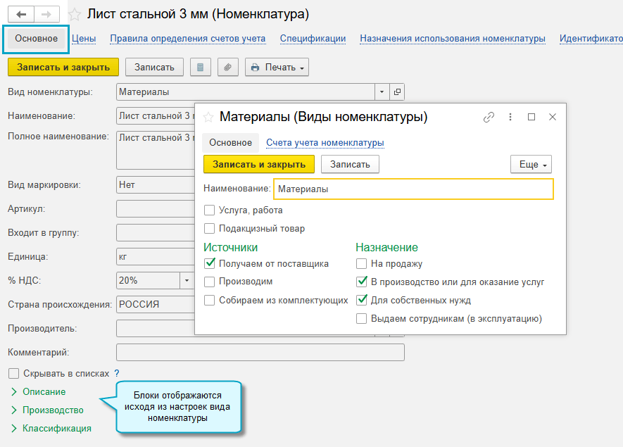 Процесс создания карточки новой номенклатуры стал более удобным. Для вида номенклатуры теперь можно настроить, как мы получаем такую номенклатуру и как планируем ее использовать. В зависимости от этих настроек в карточке номенклатуры будут отображаться только нужные реквизиты.