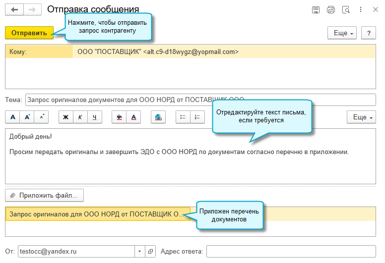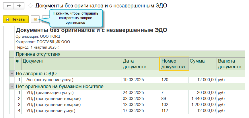 Добавлена возможность отправить контрагенту письмо с запросом о предоставлении оригиналов документов и завершении ЭДО из монитора сверки с контрагентами.