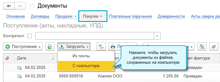 Загрузка документов доступна в журналах документов Поступление (акты, накладные, УПД), Счета от поставщиков, Платежные поручения, а в простом интерфейсе еще и из общего журнала Документы.