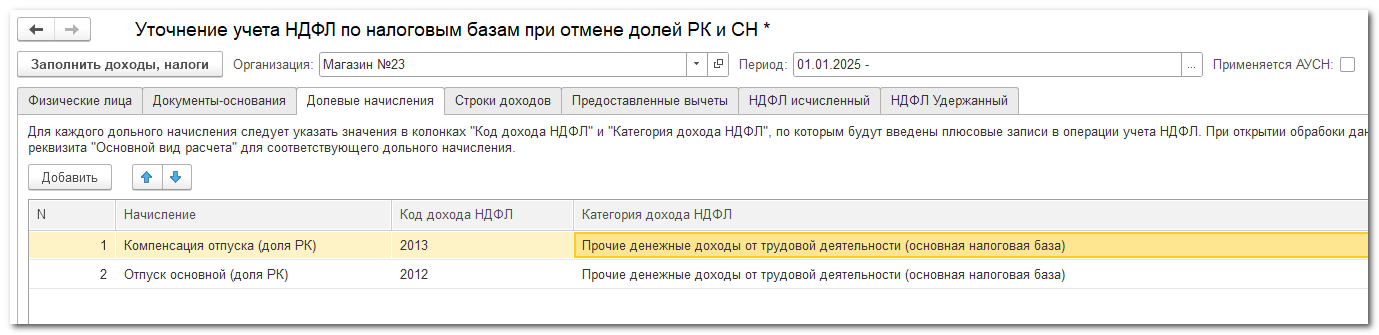 При необходимости вручную заполняем код и категорию дохода по НДФЛ, соответствующие основному начислению по среднему заработку. В результате выполнения обработки доходы в виде "долевых" начислений РК и СН в среднем заработке будут перенесены на указанные код и категорию дохода НДФЛ.
