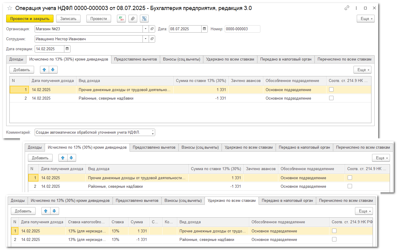 - Проводим созданные обработкой документы «Операция учета НДФЛ».
