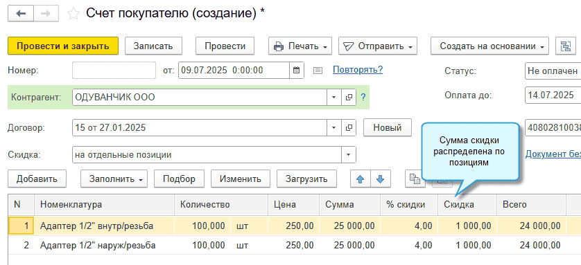 Добавлена возможность автоматически распределять общую скидку по позициям в счете пропорционально сумме.