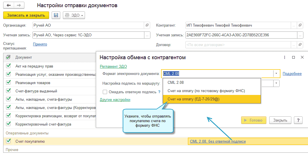 Добавлена возможность отправлять по ЭДО покупателям счета по формату, утвержденному Приказом ФНС от 20.01.2025 № ЕД-7-26/29@.