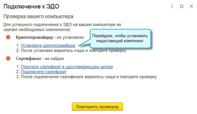 Теперь проще подключить ЭДО в простом интерфейсе. При подключении выполняется проверка компьютера на наличие необходимых программ и других компонентов.