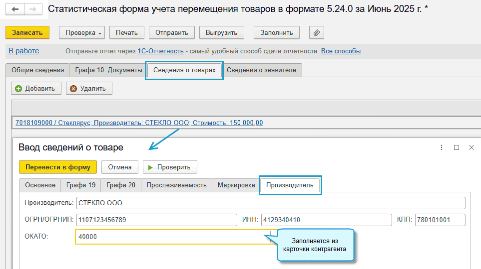 Код по ОКАТО производителя товара заполняется, если этот производитель - российская организация или ИП, когда товар реализуется в страны ЕАЭС. Для этого рекомендуется указать специальный код ОКАТО для таможни в карточке контрагента-производителя. Иначе при заполнении статистической формы он будет автоматически определяться последовательно по КПП, по ИНН.