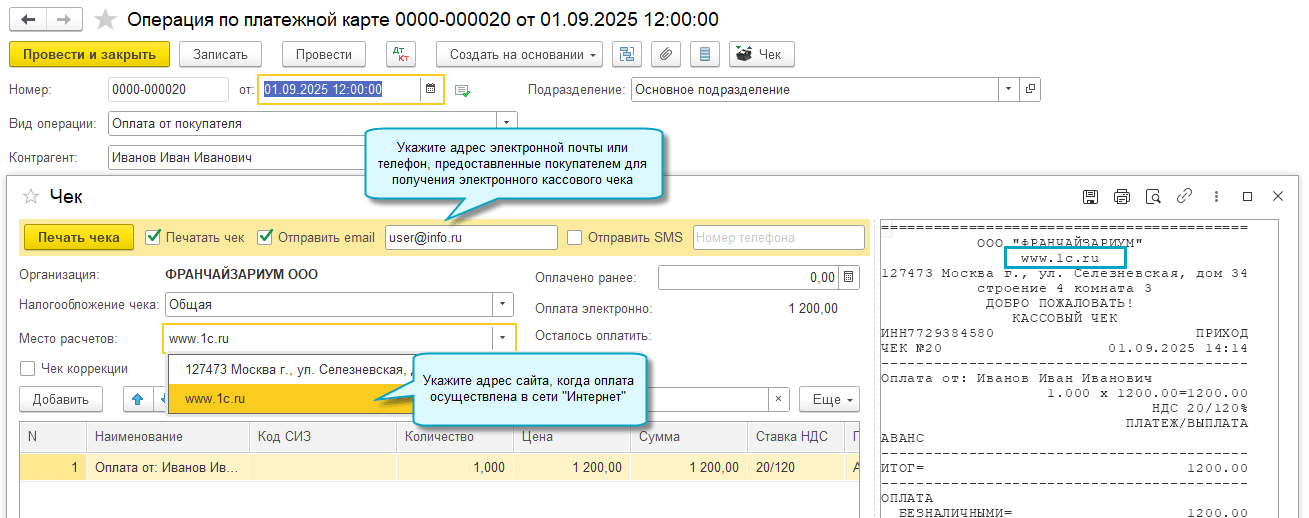 Поддержаны изменения с 01.09.2025 кассовых чеков по оплатам, полученным в безналичном порядке через интернет. В таких чеках добавлен реквизит "Признак расчета в "Интернет" (тег 1125), в реквизите "Место расчетов" (тег 1187) указывается адрес сайта и становятся обязательными к заполнению телефон или электронный адрес покупателя (Приказ ФНС России от 26.03.2025 № ЕД-7-20/236@).