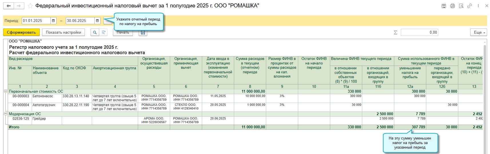 Полный интерфейс: меню "Отчеты - Налог на прибыль - Регистры налогового учета - 2.Регистры промежуточных расчетов - 2.06.Федеральный инвестиционный налоговый вычет".