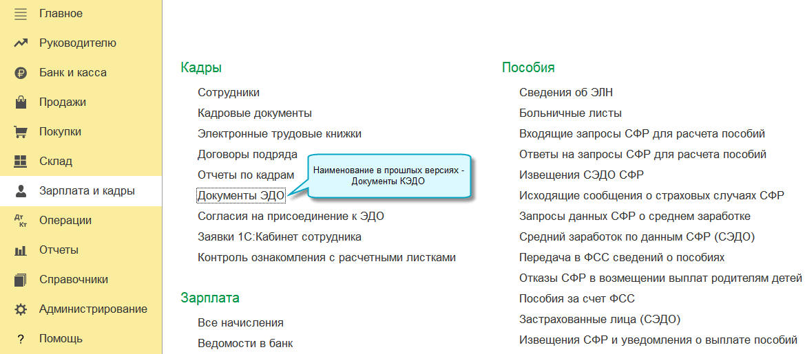 Поскольку электронный документооборот через сервис 1С:Кабинет сотрудника расширен с только кадровых документов на другие, связанные с работой (договоры ГПХ, локальные нормативные акты и другие), то вместо аббревиатуры "КЭДО" теперь используется "ЭДО".