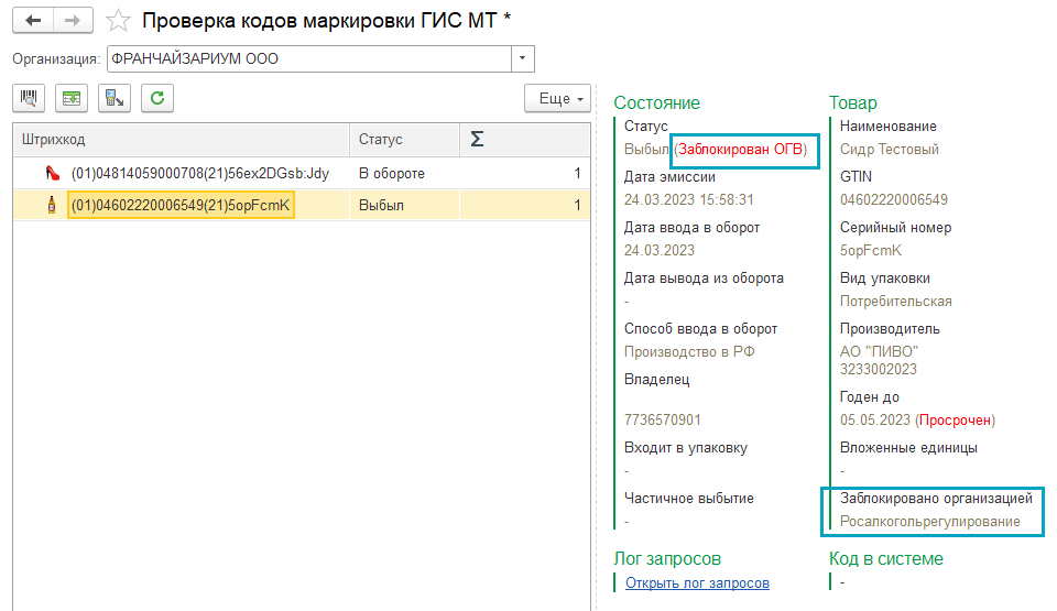 Информация о блокировке отображается также в рабочем месте "Проверка кодов маркировки ГИС МТ".