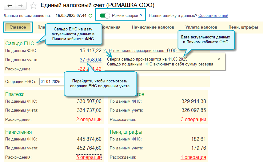Теперь удобнее сверять ЕНС по данным учета и ФНС. Добавлена закладка с результатами сверки по всем разделам, из которых можно сразу перейти к анализу и устранению расхождений. При сверке сальдо отчет по операциям ЕНС по данным учета формируется на ту же дату, на которую актуальны данные в Личном кабинете ФНС.