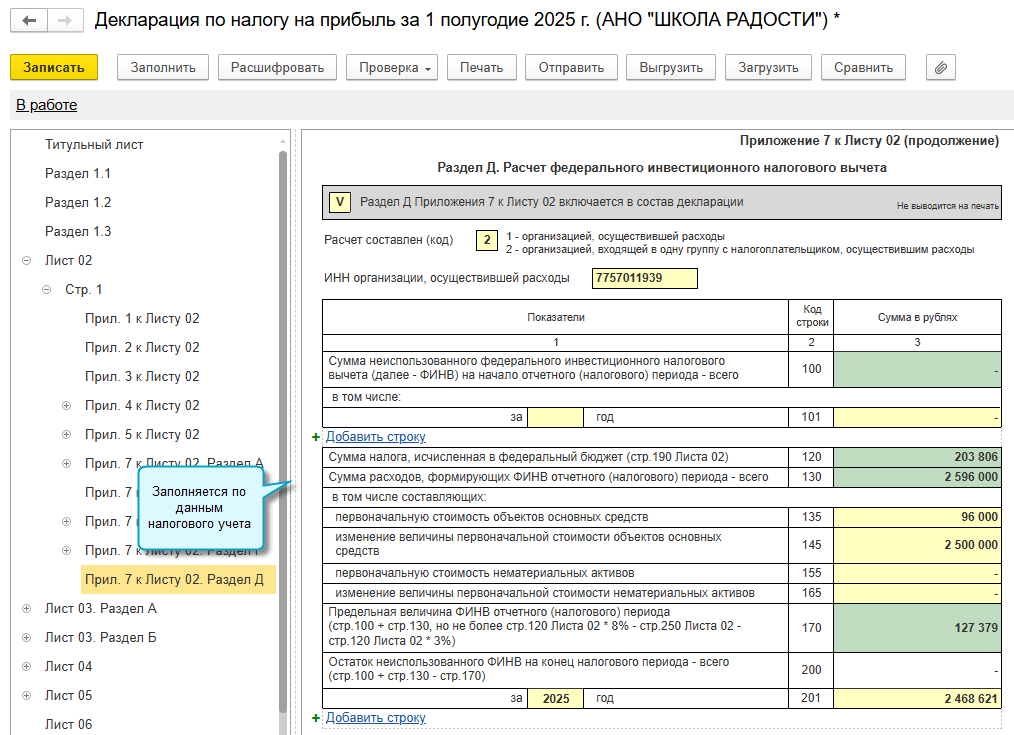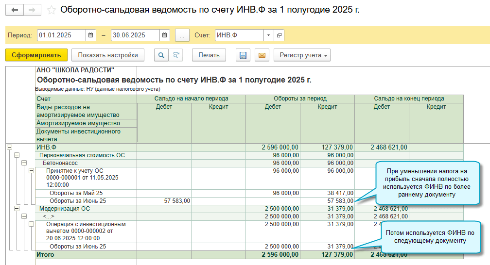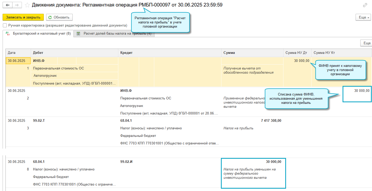 ФИНВ, рассчитанный при вводе в эксплуатацию ОС и НМА в обособленном подразделении, автоматически передается в головную организацию, если учет головной организации и обособленных подразделений ведется в одном приложении. Уменьшение налога на прибыль на ФИНВ выполняется в головной организации.