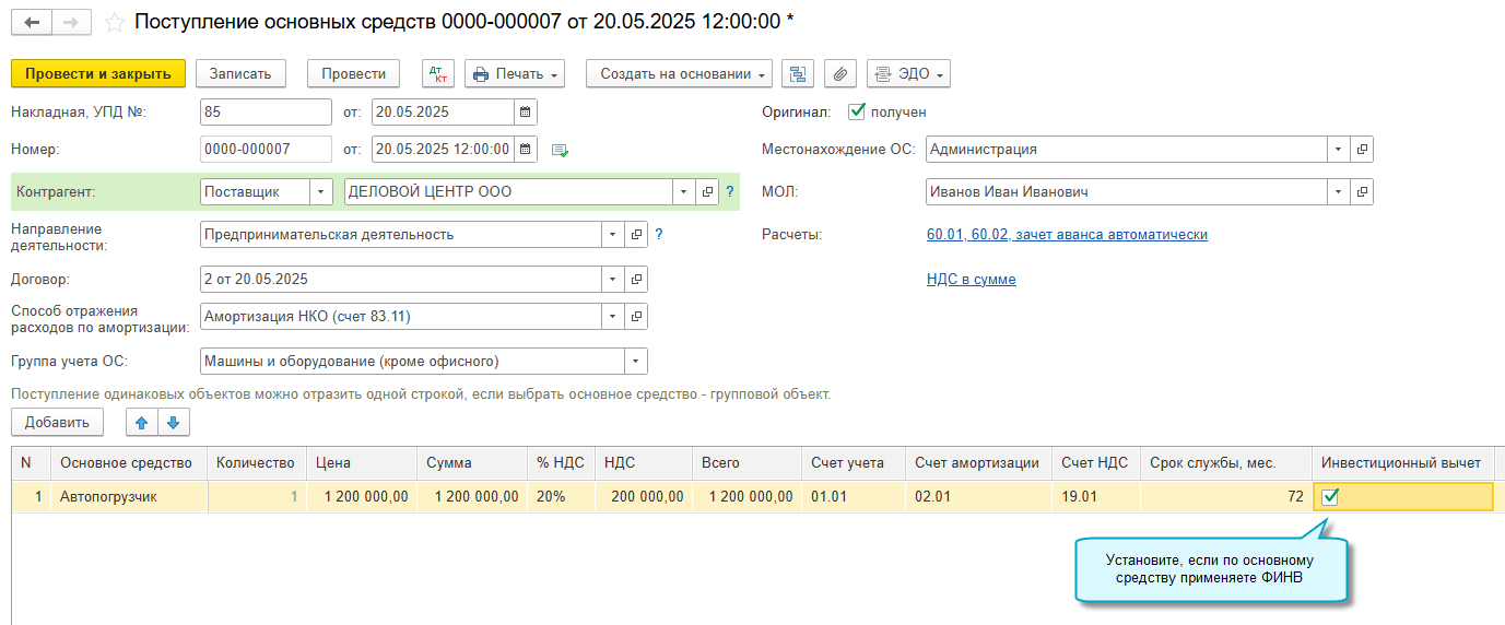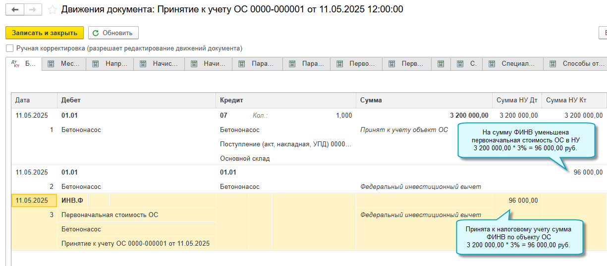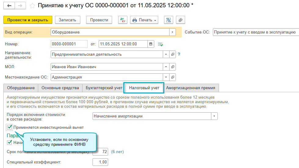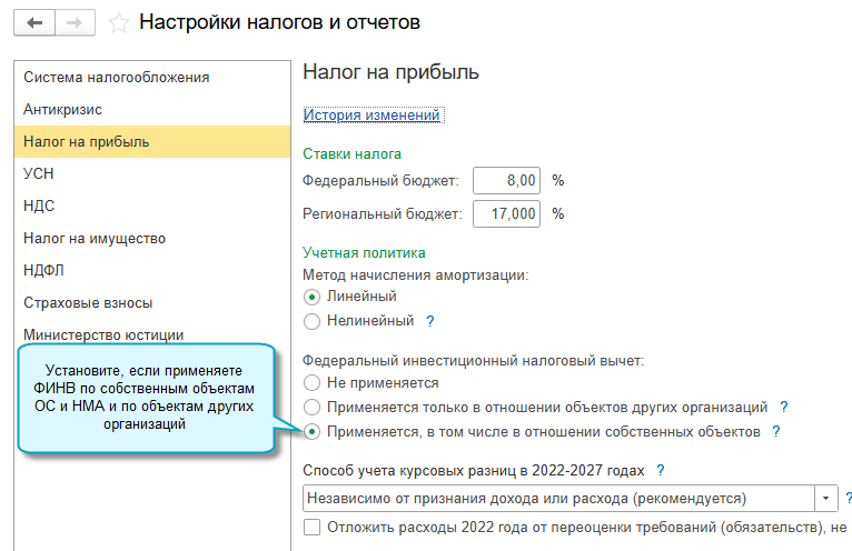 Чтобы применять ФИНВ, достаточно выполнить настройку учетной политики по налогу на прибыль и при вводе в эксплуатацию ОС и НМА указывать, по каким объектам применяется вычет.