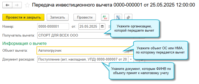 Чтобы передать ФИНВ другой организации из группы, используйте документ "Передача инвестиционного вычета".