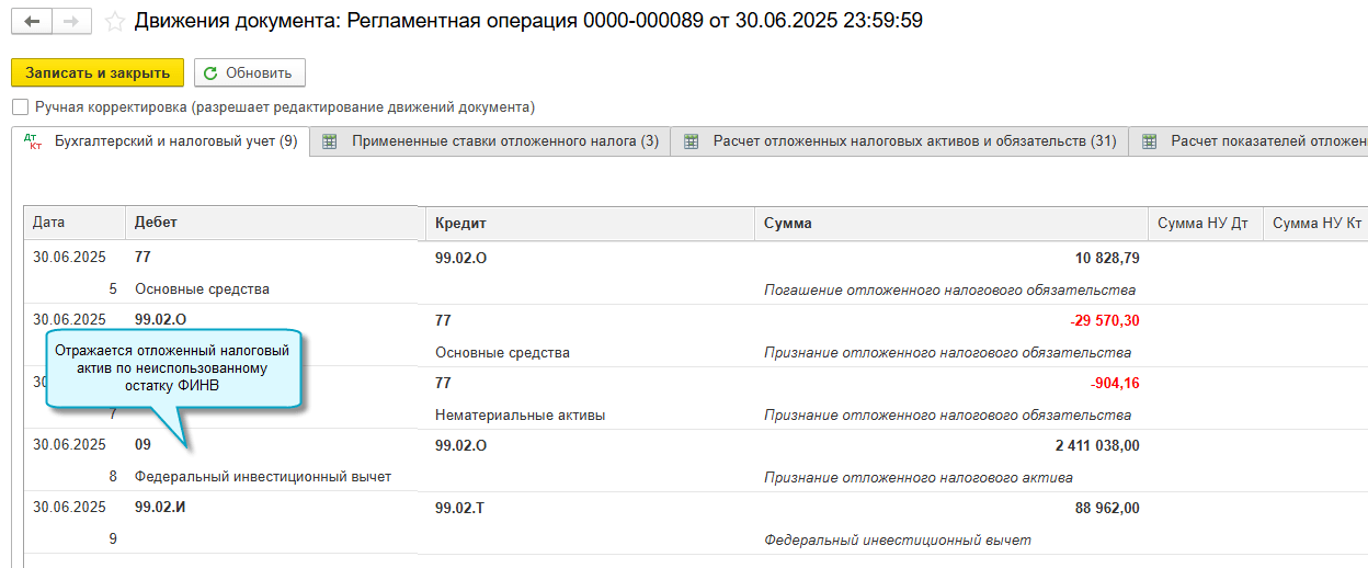 Если организация ведет учет отложенных налоговых активов и обязательств по ПБУ 18/02, то при выполнении регламентной операции "Расчет отложенного налога по ПБУ 18", корректируется отложенный налоговый актив по остатку неиспользованного ФИНВ.