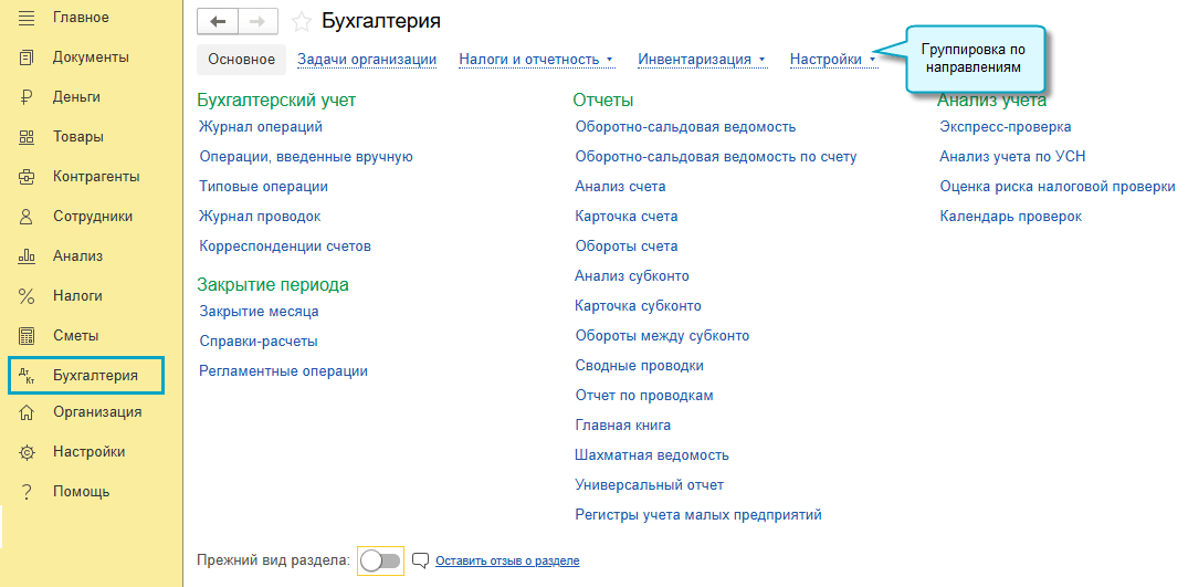 В простом интерфейсе обновлен раздел "Бухгалтерия". Документы, отчеты и отчетность теперь сгруппированы по направлениям их использования, что поможет быстрее найти необходимые. Подраздел "Прослеживаемость" перенесен в раздел "Товары".