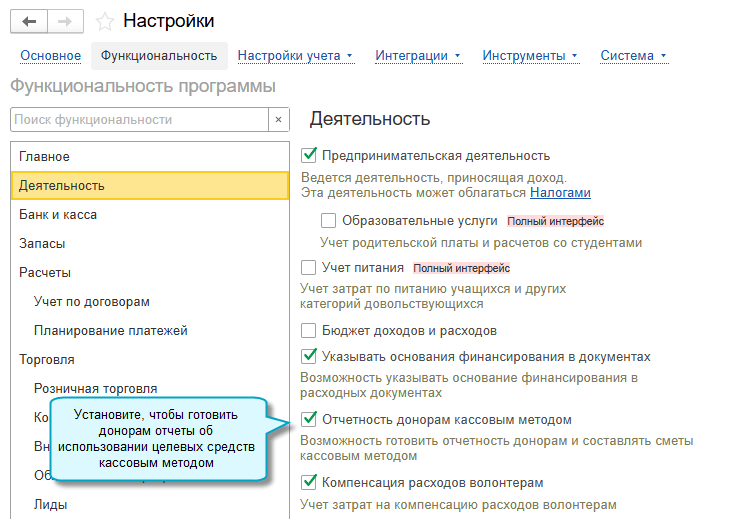 Простой интерфейс: меню "Настройки - Функциональность - Деятельность".