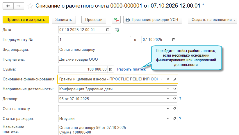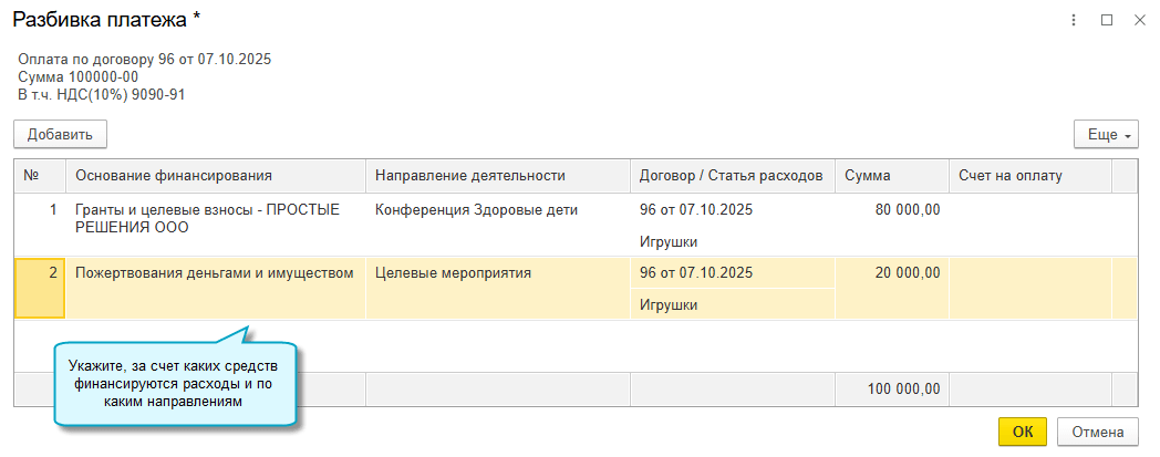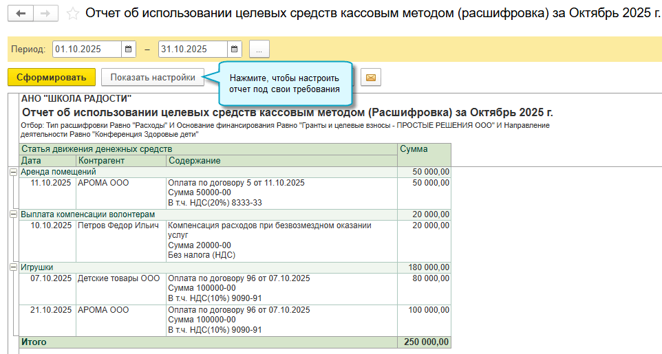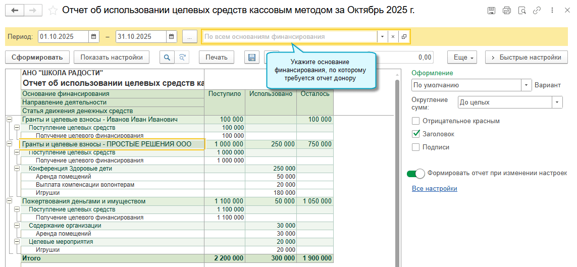 Отчет об использовании целевых средств для донора теперь можно составлять кассовым методом. Для этого при расходовании денег достаточно указывать их источник - основание финансирования.