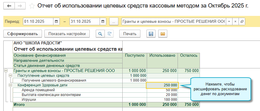 Простой интерфейс: меню "Бухгалтерия - Основное - деятельность - Отчет об использовании целевых средств (кассовый метод)".
