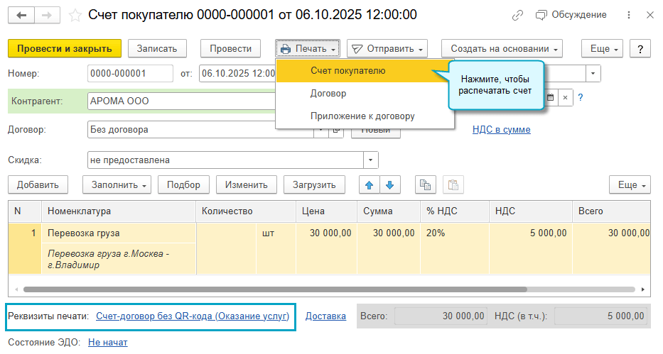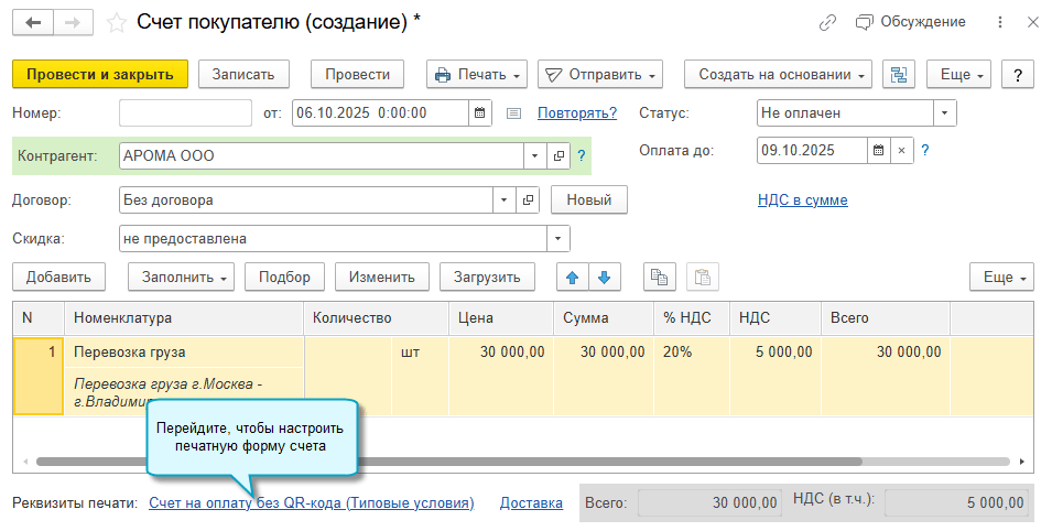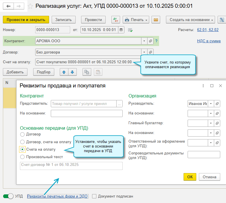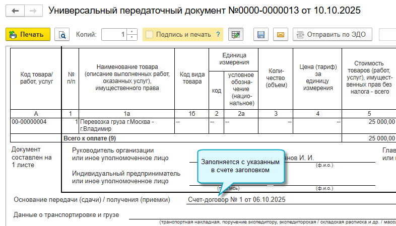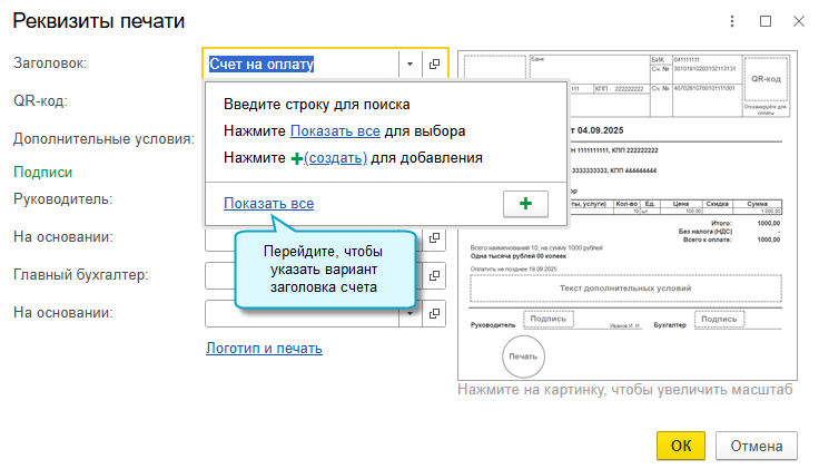 Добавлена возможность указать, с каким заголовком распечатать счет покупателю: счет на оплату, счет-оферта, счет-договор или другой вариант. Выбранный заголовок заполняется потом в УПД в основании передачи, если в нем требуется указать счет.