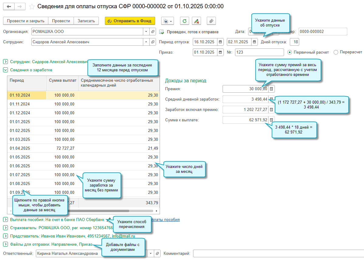 Если по результату рассмотрения Фондом сведений для оплаты отпуска требуется отправить недостающие сведения, используйте документ "Дополнительные сведения для оплаты отпуска СФР".